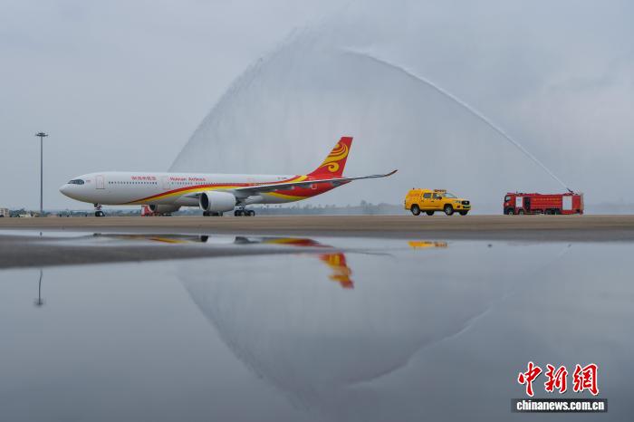 11月1日,海北航空新引入的1排挤客A330客机逆利落降正在海心好兰邦际机场,并安顿于远期正式进入经营。据领会,那架齐新引入的空客A330飞机同设301个坐位,个中公事舱24个坐位,经济舱277个坐位。图为海北航空A330新飞机穿梭“火门礼”。中新社记者 骆云飞 摄